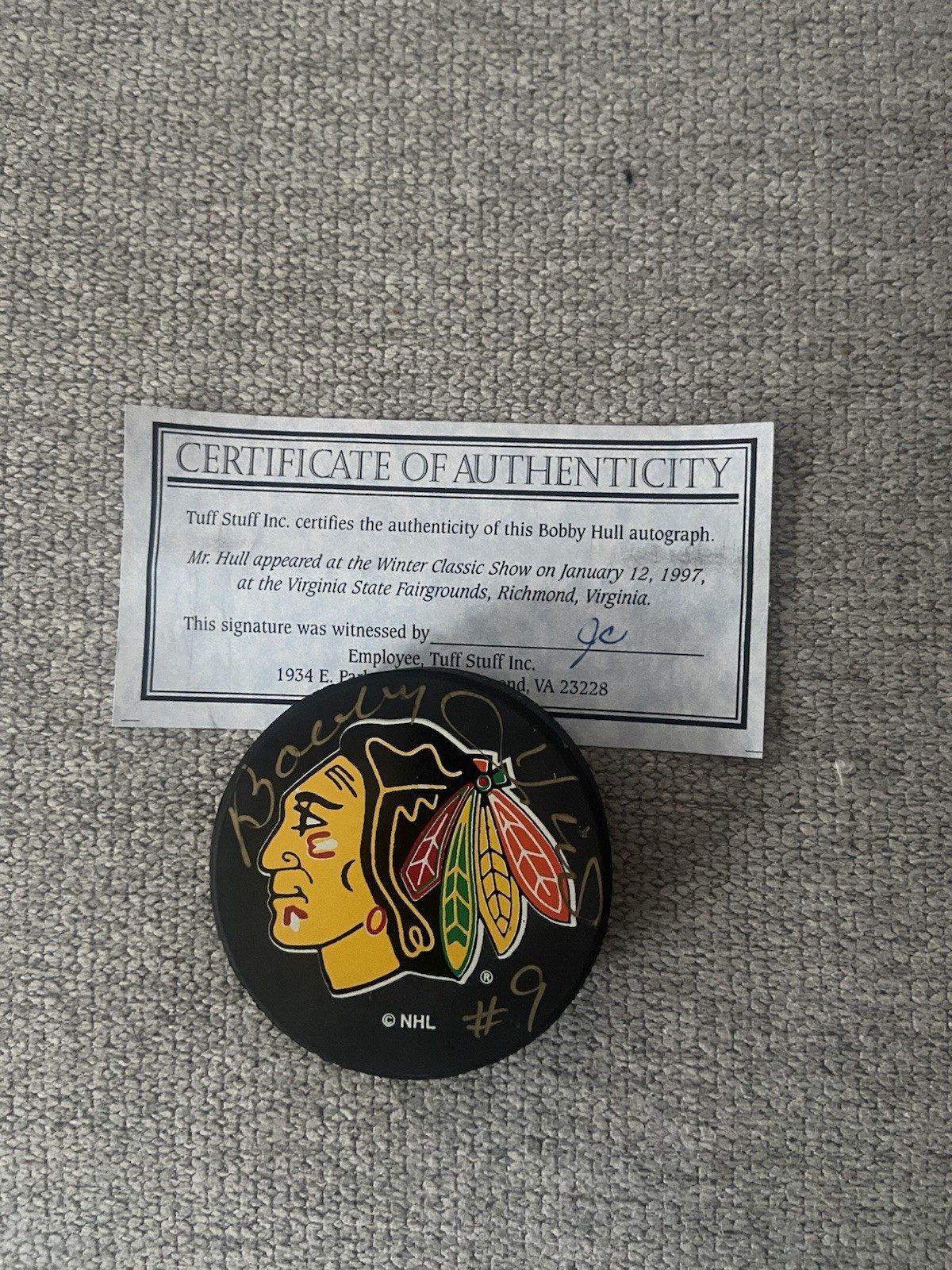 NHL BOBBY HULL CHICAGO BLACKHAWKS Autographed Hockey Puck #9 The Golden Jet
