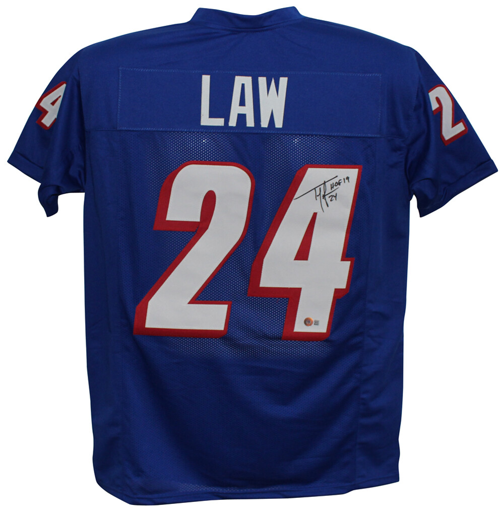 Ty Law Autographed/Signed Pro Style Blue XL Jersey HOF Beckett 35675